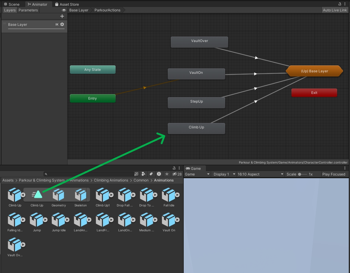 Drag the animation onto the sub-state machine (ParkourActions) and create a transition to the Base Layer (Locomotion)