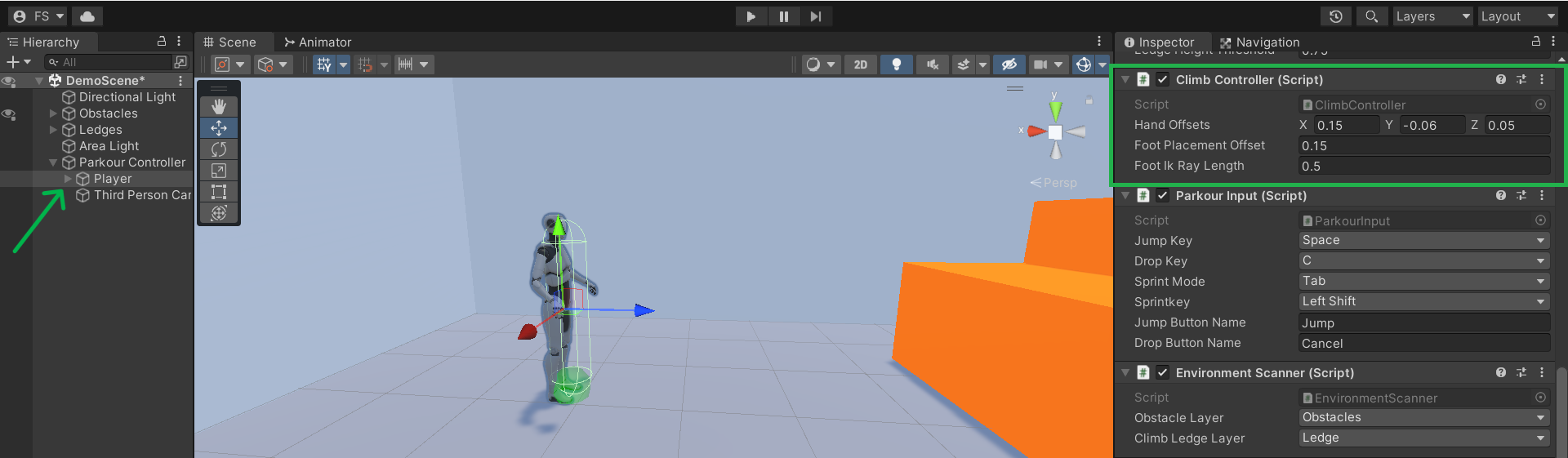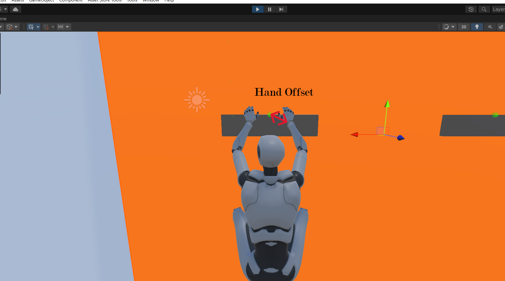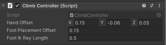 1) Hand Offset - Offset between the hand and the climbpoint while hanging. Adjust this value and make sure that the hand is correctly placed on the climbing ledge