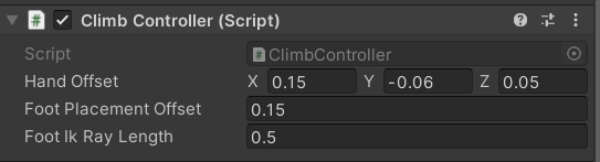 3) Foot IK Ray Length - Length of the raycast used for finding the foot IK position on the wall. If this raycast hits, the character will be in braced hang, and otherwise, the character will be in free hang.